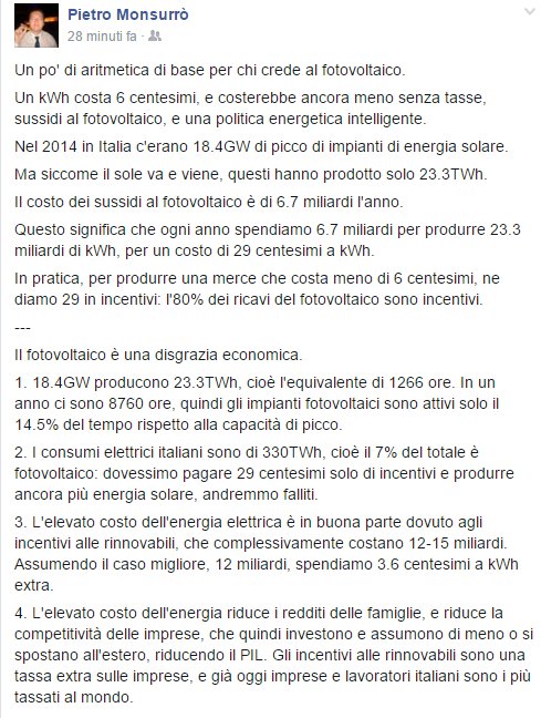 Più che altro è una cazzata, dato che per una volta non siamo affatto indietro, tutt'altro (il 37,5% della domanda annua è già ricoperto da rinnovabili, il mix di grandi Paesi industrializzati europei quali Francia e Germania è il seguente https://www.facebook.com/luca.spatar...09441393857679), e visto quanto già masochisticamente ci smeniamo, vedi sotto.