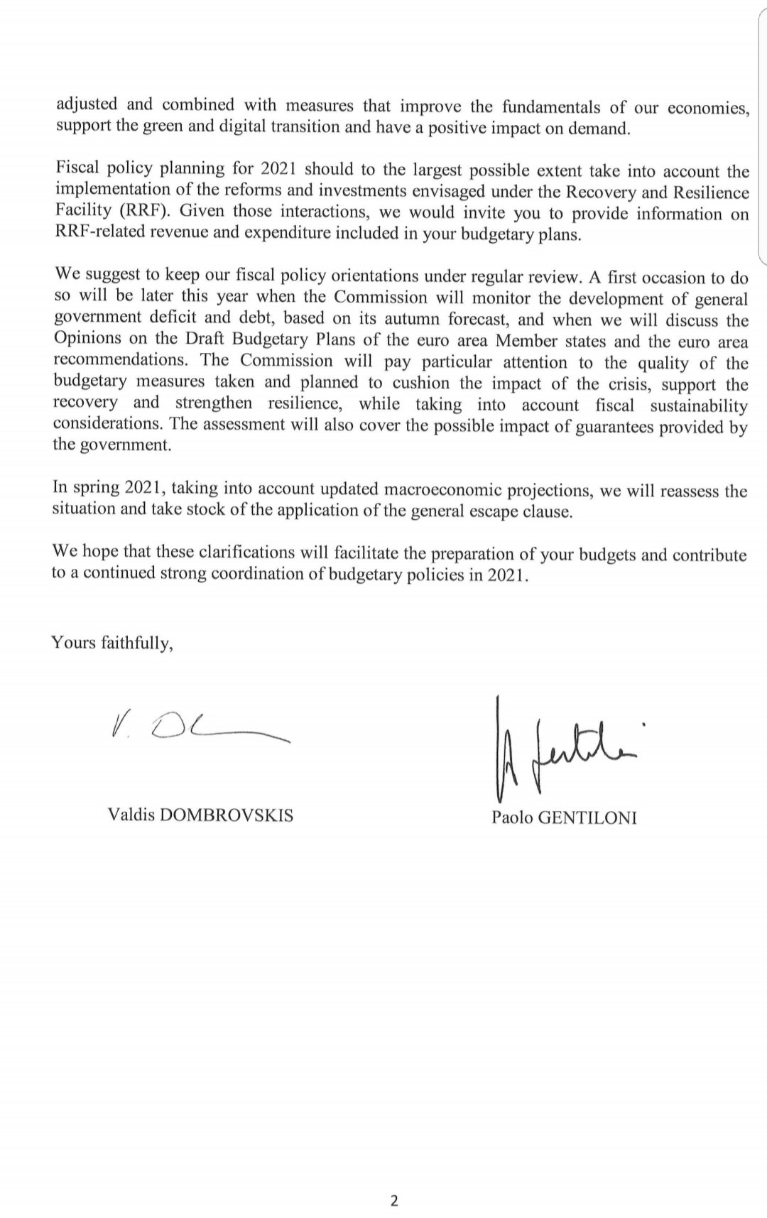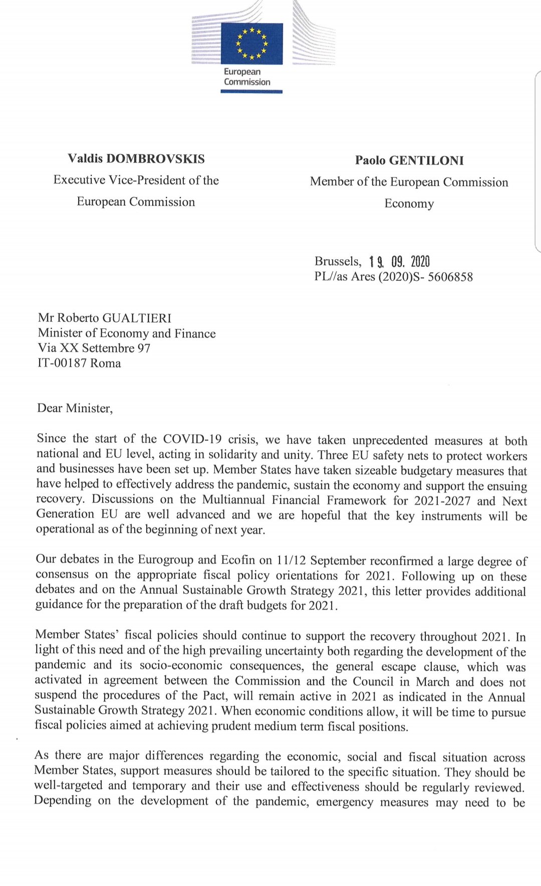 Lettera Gentiloni-Dombrocoso del 19/9/2020