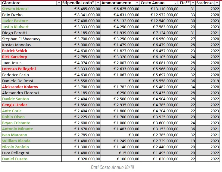 Prima di presentarvi i dati, ci tengo ad indicare la loro provenienza: gli ammortamenti sono esatti e prelevati direttamente dal bilancio; lo stipendio, invece, non viene comunicato da As Roma ma deriva dallo studio effettuato dalla Gazzetta dello Sport (qui una rielaborazione di Calcio e Finanza degli stessi dati).