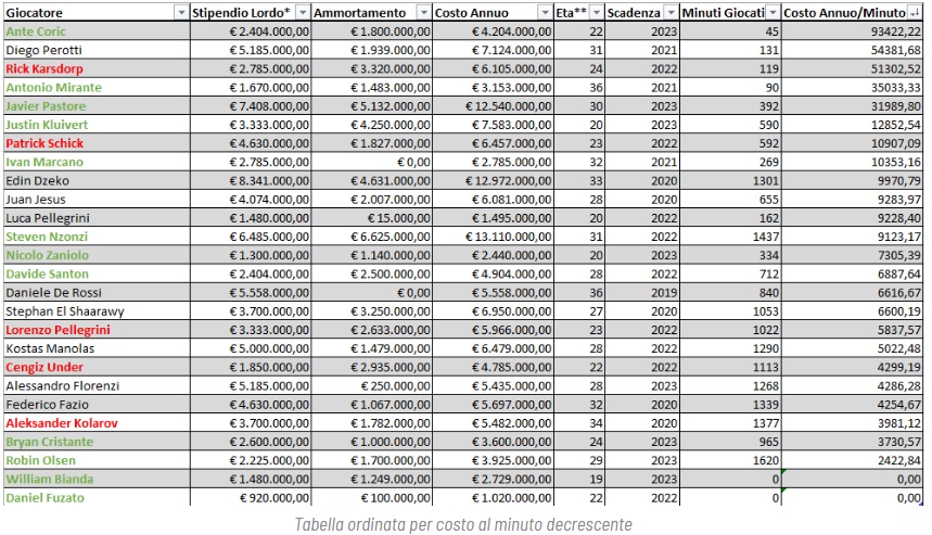 La parte bassa della tabella, infatti, è tutta “verde”, eccezion fatta per Luca Pellegrini, tra di loro, però, ci sono ben pochi “titolari”, gli unici sono Olsen e Cristante, il cui dato è però falsato dal prestito di cui ho parlato in precedenza.