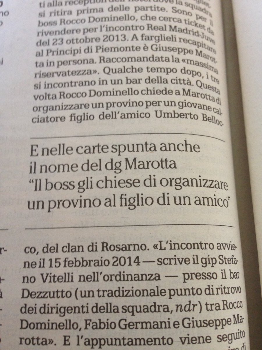 Di certo non scado nel ridicolo come anni fa in tanti hanno deciso di fare, emettendo sentenze a casaccio e parlando di club colluso con la camorra. Tra l'altro la tecnica del "spunta il nome di" è una delle pagine più deprimenti del giornalismo italiano. Marotta non è neanche indagato.