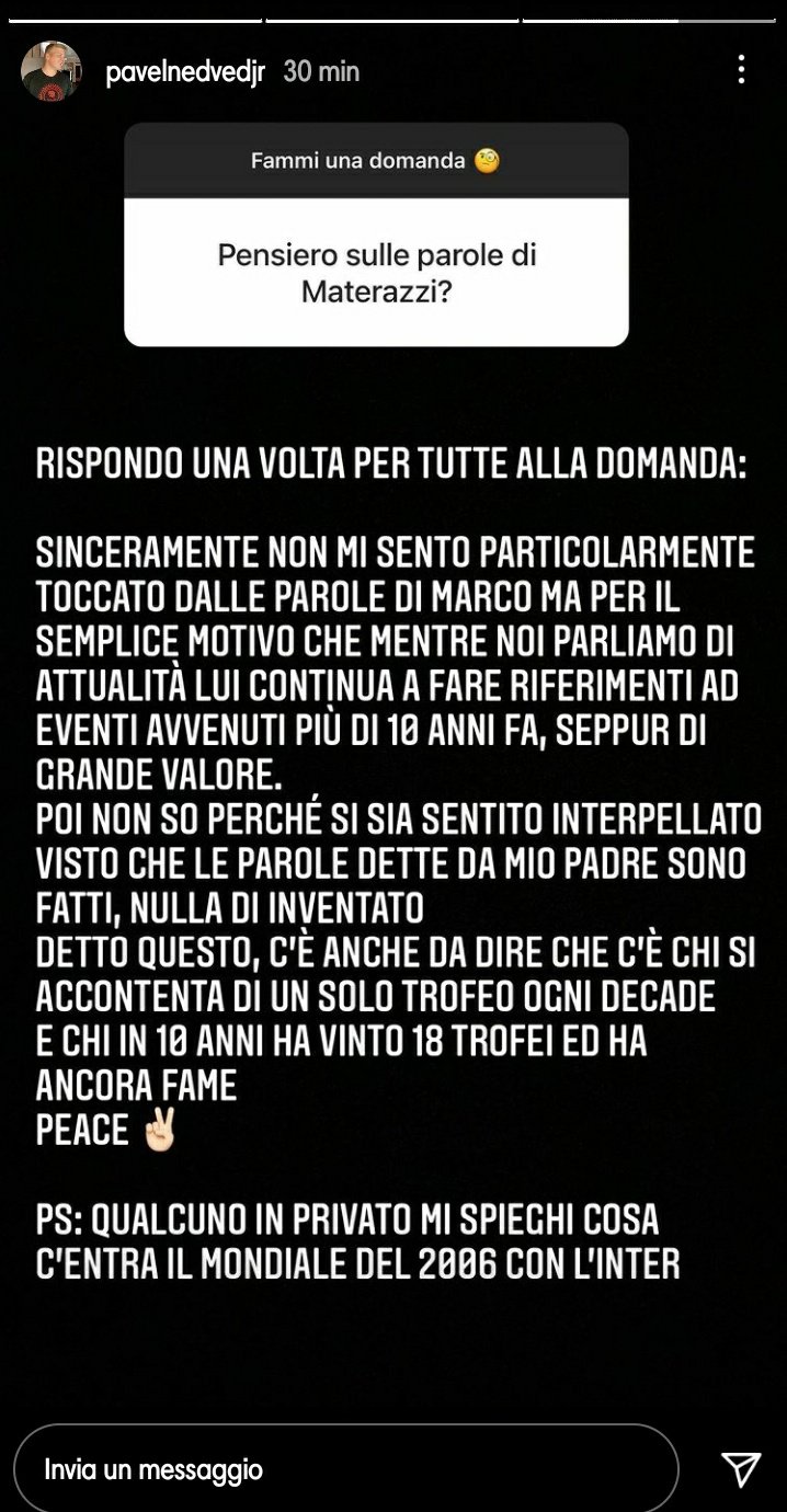 Il tempo, ma soprattutto il campo, dirà. La Juve non può fallire la qualificazione Champions e deve vincere la Coppa Italia contro l'Atalanta per salvare parzialmente una stagione che registra l'eliminazione agli ottavi di Champions contro il Porto e la fine del ciclo vincente in campionato, con l'Inter lanciata verso lo scudetto. «La rivalità c’è e ci sta sempre – dice Pavel Nedved - ma deve rimanere tale, in amicizia. Non ho nessun messaggio per Antonio: Conte è stato preso dall’Inter per vincere e lui lo sa fare, adesso è dieci punti avanti e ha l’obbligo di vincere. Se sta costruendo come ha fatto alla Juve? Può essere, anche perché è con Beppe Marotta e so come lavorano loro due insieme. Marotta per tutti noi è stato un grandissimo maestro: siamo contenti per loro».