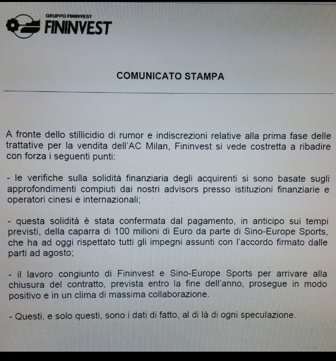 A fronte dello stillicidio di rumor e indiscrezioni relative alla prima fase delle trattative per la vendita dell’AC Milan, Fininvest si vede costretta a ribadire con forza i seguenti punti: - le verifiche sulla solidità finanziaria degli acquirenti si sono basate sugli approfondimenti compiuti dai nostri advisors presso istituzioni finanziarie e operatori cinesi e internazionali; - questa solidità è stata confermata dal pagamento, in anticipo sui tempi previsti, della caparra di 100 milioni di Euro da parte di Sino-Europe Sports, che ha ad oggi rispettato tutti gli impegni assunti con l’accordo firmato dalle parti ad agosto; - il lavoro congiunto di Fininvest e Sino-Europe Sports per arrivare alla chiusura del contratto, prevista entro la fine dell’anno, prosegue in modo positivo e in un clima di massima collaborazione. - Questi, e solo questi, sono i dati di fatto, al di là di ogni speculazione.
