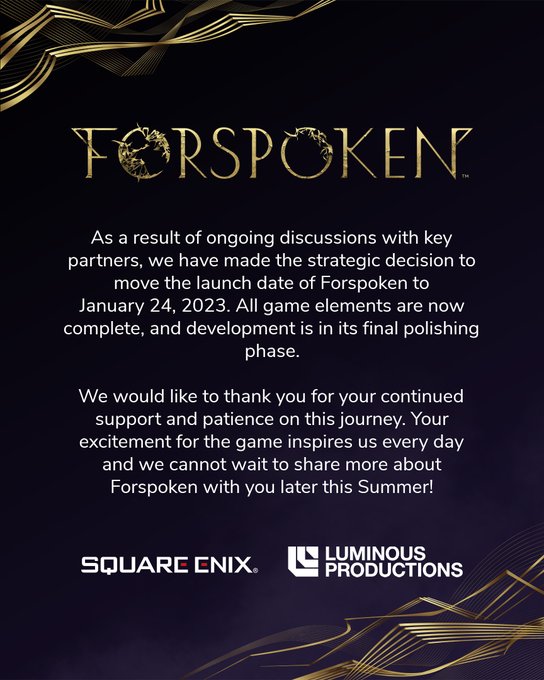 Ho l'impressione che, se quest'ultimo fosse stato rinviato, Forpoken sarebbe uscite a fine ottobre/novembre.