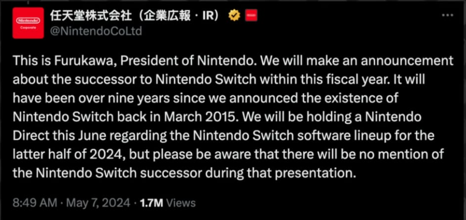 A Giugno ci sara' invece un Nintendo Direct relativo alle uscite per la Switch attuale, NON parlera' in nessun modo della "Switch 2"