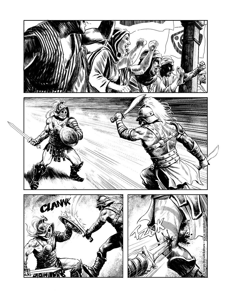 Ecco, abbiamo buone tavole, dinamiche, ben proporzionate, tratteggiate da un artista a suo agio con l'anatomia umana -e credetemi se vi dico che questo non è per nulla un talento cosi' scontato per un disegnatore, soprattutto in casa Bonelli...-; un pelo su e giù la qualità generale.