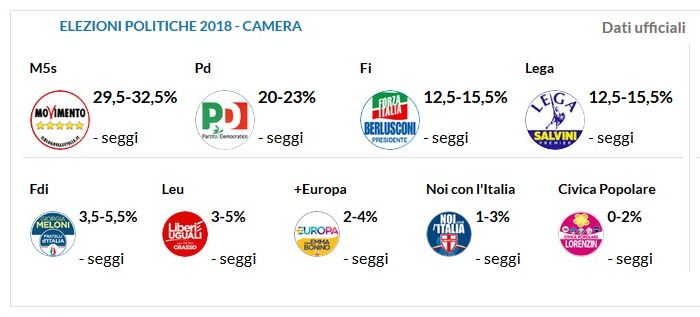 prime proiezioni al 31%, pd crollato, coalizione centrodestra al 32%