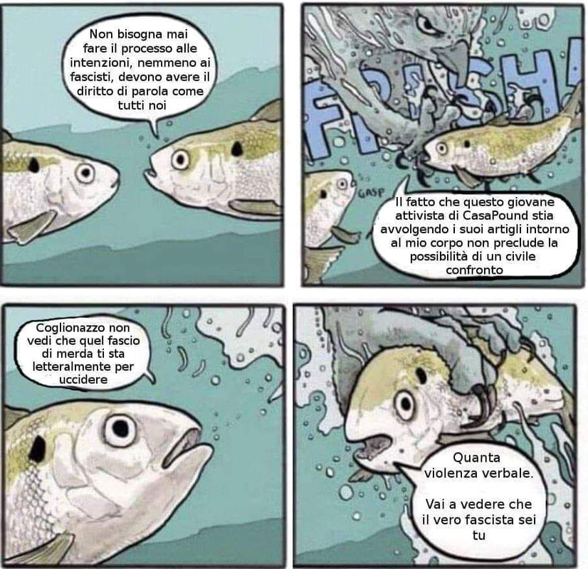 Fa anche sorridere quando parlate di metodi fascisti per farli tacerequando in maniera non violenta semplicemente alcuni si sono dissociati e hanno detto che non sarebbero andati. Quando la cosa ha cominciato a creare più danni economici del previsto (non per la casa editrice che ha fatturato a bestia), in maniera puramente capitalistica il salone ha trovato il modo per mandarli via con la scusa che ebbeh sono fascisti ora sì che ce ne rendiamo conto aiuto shdado facceli mandare via.