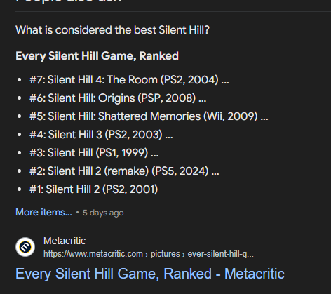 (che in questo caso mi trova d'accordo nel senso che anche per me Silent Hill 2 fu il piu' importante di tutti gli storici SH )