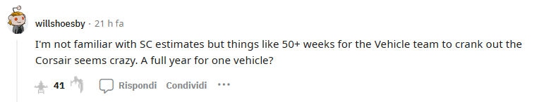 un simulatore 1:1 di vita spaziale non rientra nelle mie corde :nono: ci avevo speso tanti soldi al tempo perchè la roba sci-fi e le astronavi mi fanno impazzire letteralmente e la roba dell'assicurazione mi aveva preso male con l'idea di perdere le navi in gioco, quindi volevo qualcosa che mi permettesse di cazzeggiare "senza impegno". Poi lo hanno voluto trasfmormare in un simulatore di vita dove devi fare ogni azione come se fosse la realtà e quindi ciao :nono: sono sicurissimo che quando uscirà forse manco ci giocherò :sisi: se non la campagna così giusto per (pc permettendo, perchè ci vorrà un intel 20000 e una RTX 10090 per farlo girare) :sisi:
