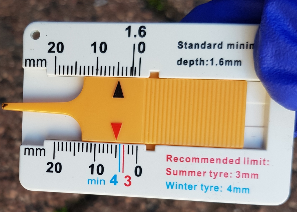 Visto che volevo aver modo di poter constatare l'usura delle gomme per conto mio senza dipendere troppo dal meccanico, ho approfittato del cambio gomme estate/inverno per comprare degli "strumenti" per verificare l'usura del battistrada