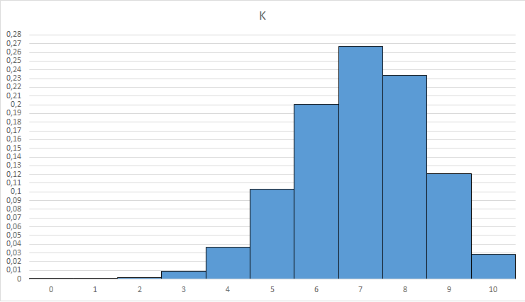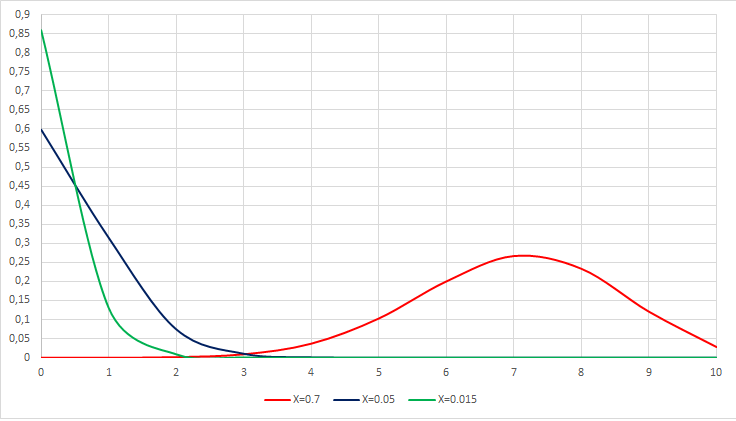 Qui invece la probabilità che l'untore contagi k su 10 persone sempre considerando x=0.7