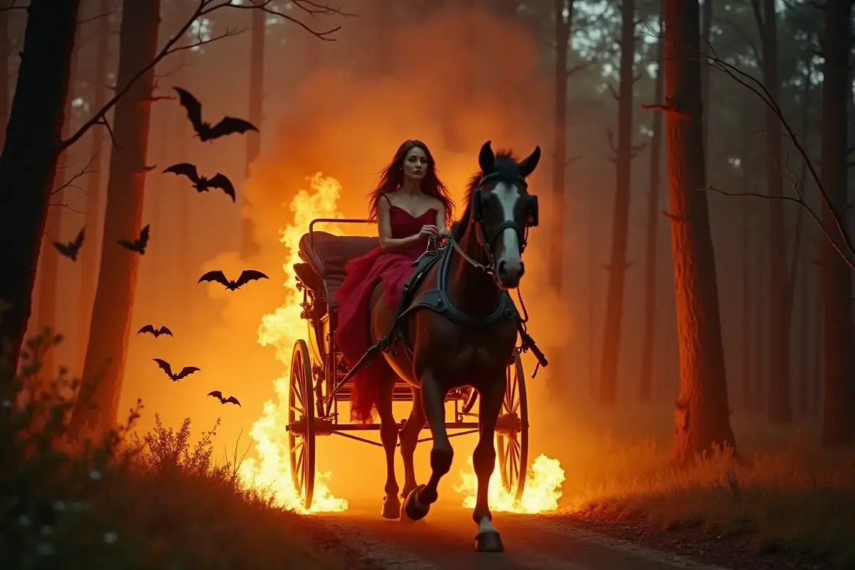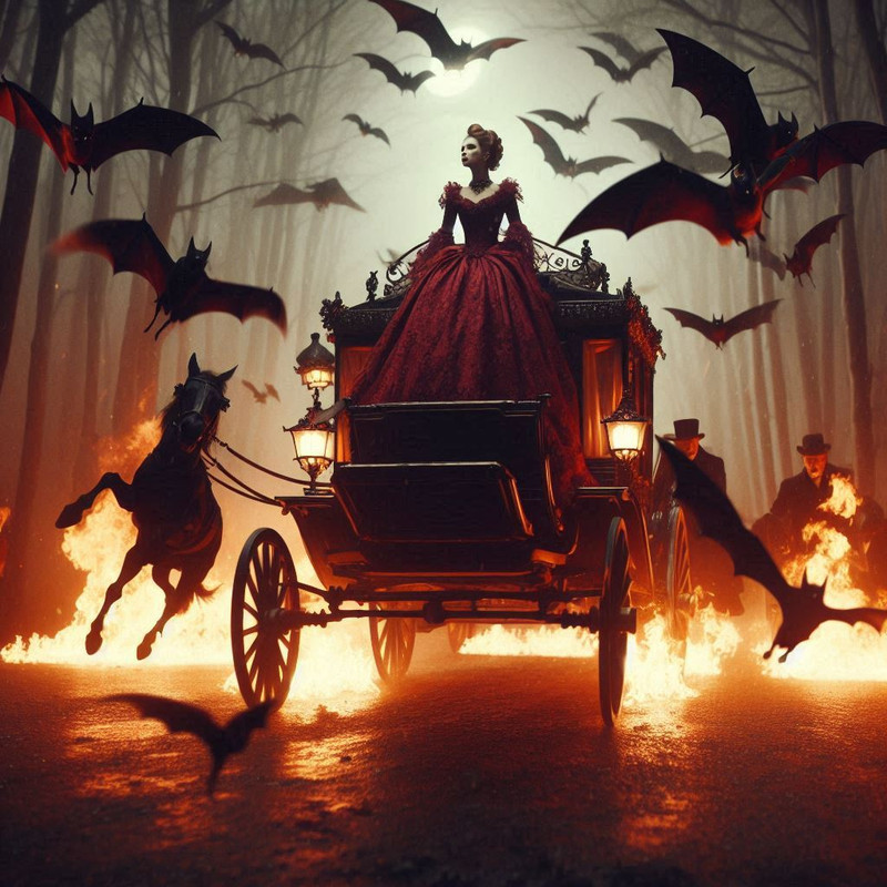 Cinematic shot of a a carriage on fire. A young duchess in an elegant vermilion dress is driving. Numerous vampire bats are attacking the carriage as it races through a dark and scary forest