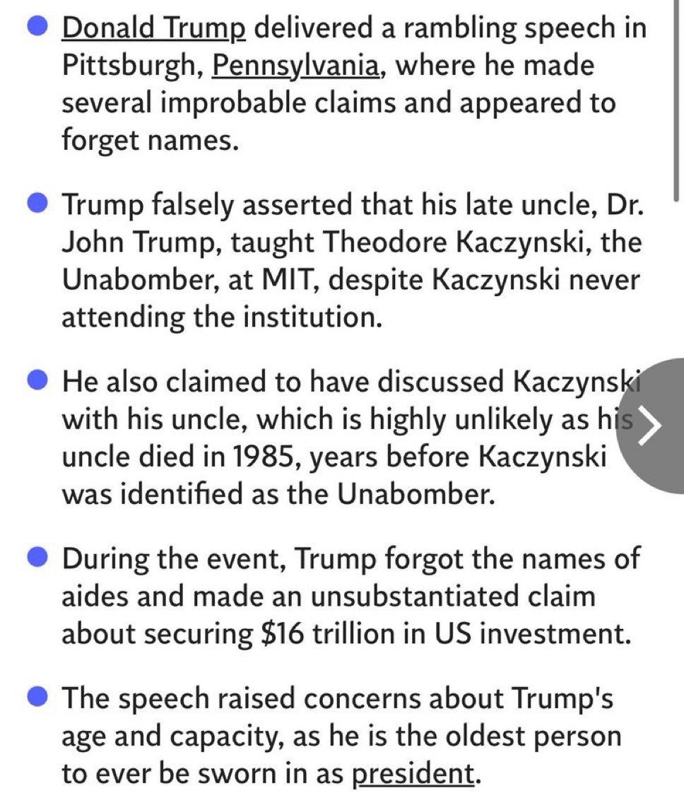 Tra un po' si incasina, dice di aver bombardato l'isola di Epstein perchè c'erano gli immigrati cattivi e lui non ci poteva più andare a scopare le minorenni, ha fatto risparmiare ai pedofili suoi fedeli amici centinaia di miliardi dollari, MAKE ALZHEIMER GREAT AGAIN!