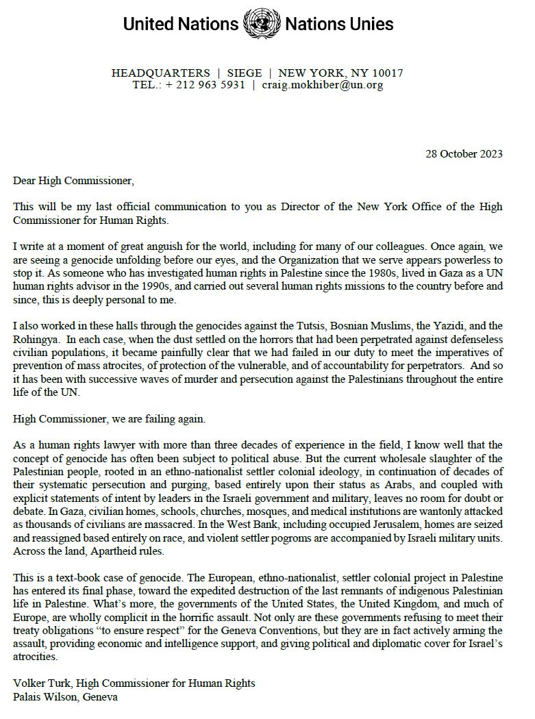 credo che qui ci sia una lettura importante: è la lettera di dimissioni del direttore dell’ufficio di New York dell’alto commissario per i diritti umani delle Nazioni Unite. Un avvocato dei diritti umani con trent’anni di esperienza, che condanna senza mezzi termini non solo quello che sta succedendo in Israele (che viene descritto come basato su “un’ideologia colonizzatrice etnonazionalista”) ma anche la reazione da parte dei Paesi occidentali.
