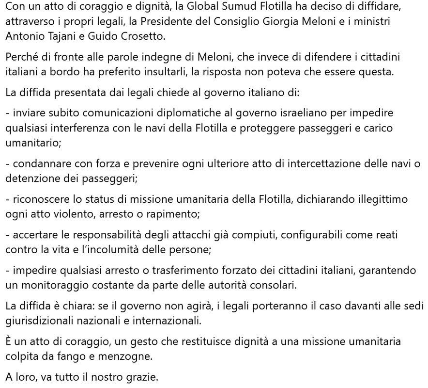 io non capisco perchè debbano forzare così la mano al nostro governo. Poi Giorgia fa bene a dire che lo stanno facendo apposta per romperle le scatole. Doveva essere una missione internazionale nata da un moto popolare e affambagno i governi che cagano il voler popolare, anche di critica al nostro governo che non sta facendo niente. Invece lo vogliono mettere in mezzo a qualunque costotra un pò mi aspetto una protesta perchè si sono rotti d'andare in barca e vogliono un volo di stato italiano per arrivare a gaza