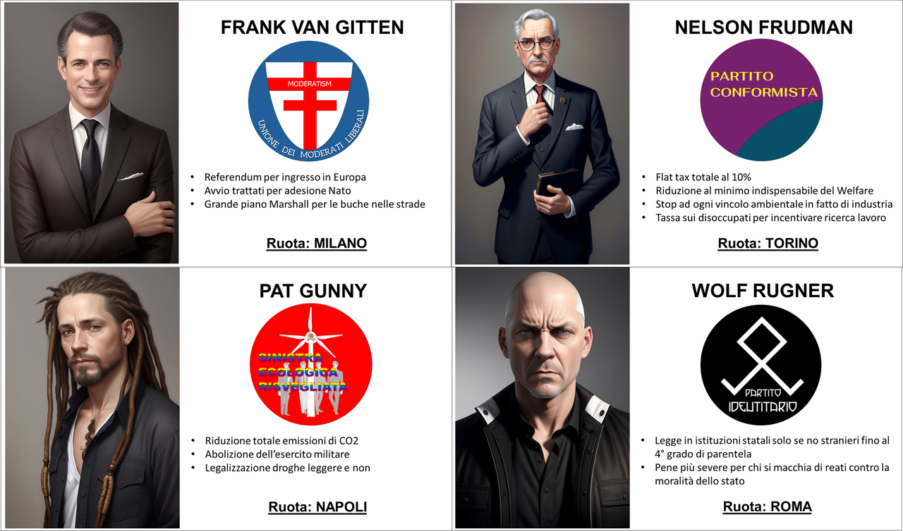 SISTEMA DI VOTO: il voto avverrà per mezzo dell'estrazione del Lotto. Ad ogni candidato premier (4) è associata una ruota del lotto. Nell'estrazione di Sabato 4 Maggio i primi 3 numeri estratti (ordine di estrazione) di ciascuna ruota verranno sommati e rappresenteranno i voti ottenuti da ciascun partito.
