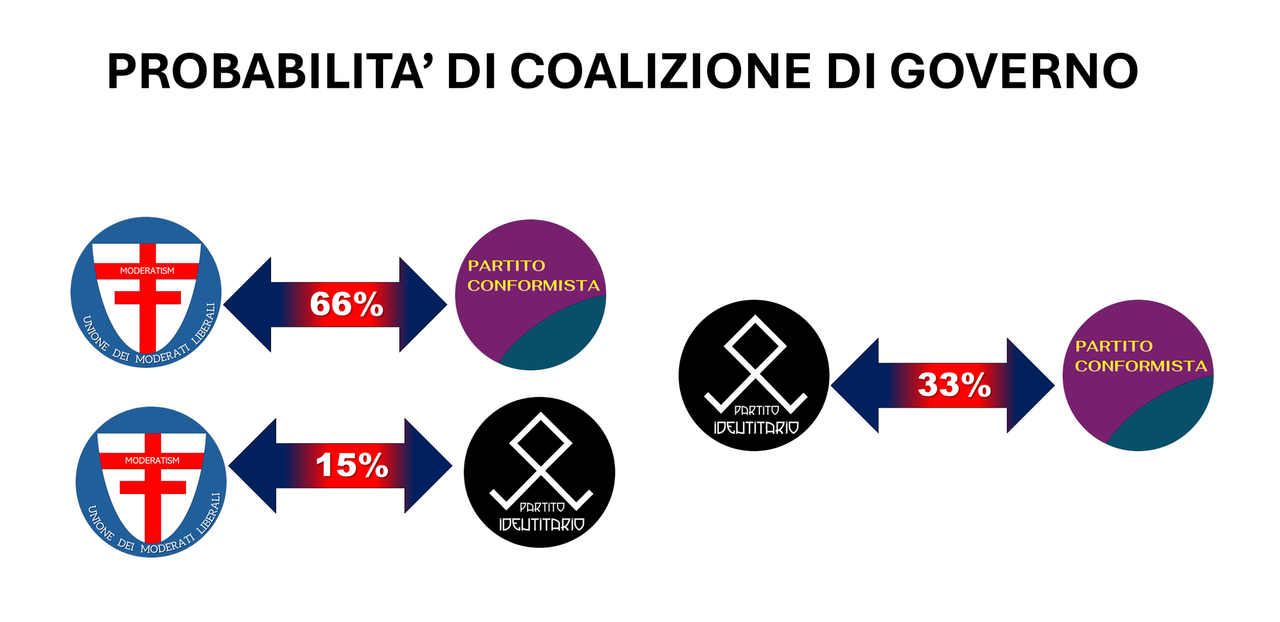 Qualora non si dovesse ottenere una maggioranza assoluta, il primo partito con più seggi in totale (al termine del secondo turno) potrà formare una coalizione di governo secondo le probabilità elencate nell'immagine n°2. L'esito della coalizione sarà deciso mediante estrazione del primo numero su Ruota Nazionale Lotto del giorno 9 Maggio