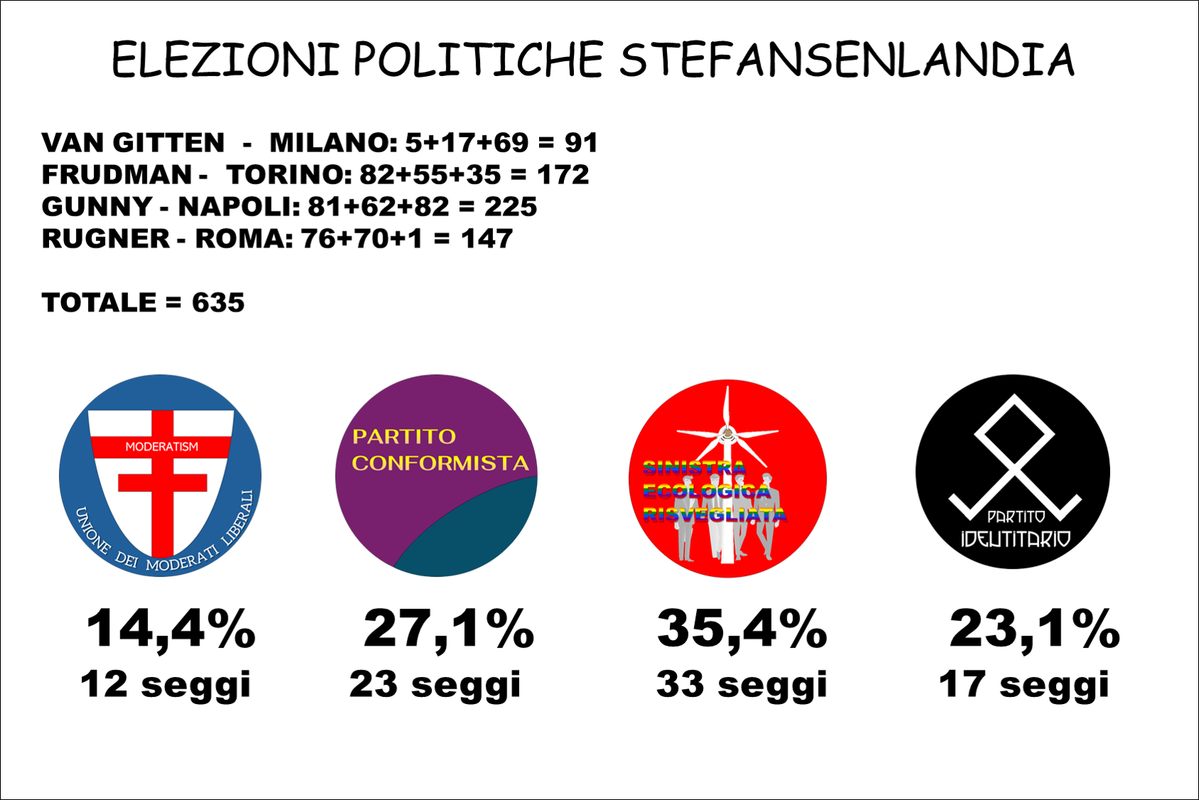 In base alla percentuale di voto ciascun partito otterrà l'X% dell'85% dei seggi disponibili. Qualora un partito dovesse ottenere il 50%+1 dei voti, oltre ai seggi già conquistati conquisterà il bonus di maggioranza del restante 15% dei seggi, e il candidato premier sarà eletto Premier di Stefansenlandia.
