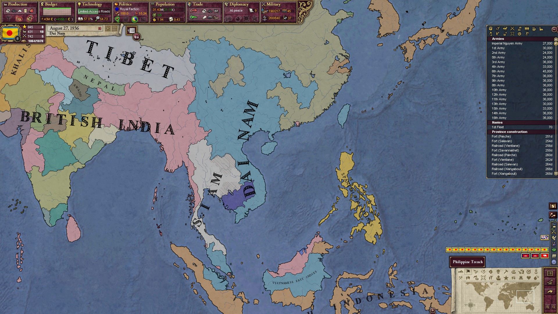 Peccato non essere riuscito ad annettere il Siam, che è stato sferato subito dall'UK, e solo nel lategame avevo un esercito abbastanza buono da battere gli inglesi. Per fortuna che appena a nord c'era la Cina, e appena ha avuto qualche guerra interna o col Giappone ho potuto prendermi le sue provincie con un manpower assurdo, e da lì tutto in discesa. Un'altra grande rottura è stata che per TUTTO il gioco nessuno mi ha sferato, quindi ho fatto una fatica assurda a far partire l'industria.