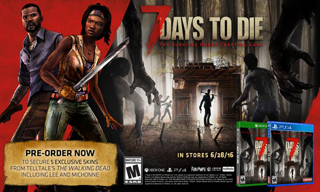 Telltale Publishing today announced that the hit survival horde crafting game 7 Days to Die will release on PlayStation 4 and Xbox One for the first time on June 28th as both a digital and retail product in North America, and digitally in Europe; and will be available on July 1st for the first time at retail in Europe. The recommended retail price is $29.99 USD or equivalent, and the game is currently available for pre-order at GameStop, Best Buy, GAME, and Amazon. 7 Days to Die is published in collaboration with the Dallas-based independent developer, The Fun Pimps.