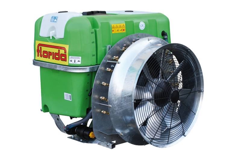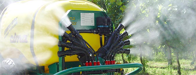 esempio di atomizzatore a basso volume trainato in azione.La differenza con quelli convezionali sta nel fatto che la pompa che distribuisce il prodotto spruzza nei bocchettoni grandi che sono collegati a turbine che generano enormi volumi d'aria in modo da ridurre il prodotto uscito in tantissime micro goccioline in termini di micron e spararle sulle foglie,alcune case che realizzano questi atomizzatori a basso volume hanno aggiunto dei strumenti su questi atomizzatori in modo che caricano elettrostaticamente nel uscita dai bocchettoni queste microgoccioline in modo da restare il più al lungo possibile sulle foglie,rami,fiori,tronco del albero.Questo tipo di attrezzatura monta cisterne più piccole rispetto a quelli convenzionali perchè lavorando diversamente viene distribuito il prodotto con un minore volume di acqua e un minore fenomeno della deriva.Vorrei specificare che con tutti gli atomizzatori non si distribuiscono solo insetticidi ma anche acaricidi,fungicidi,concimi fogliari,ed altro prodotti specifici di tipo convenzionale oppure approvati per la coltura biologica,per i primi ci vuole il tesserino per quelli approvati per le colture biologiche no,ha dimenticavo prima di utilizzare l'atomizzatore bisogna indossare i dispositivi protezione individuale se si utilizzano prodotti convenzionali sopra elencati.Riguardo alle cisterne degli atomizzatori inglobano piccole cisterne lavamani e quelle per l'autolavaggio della cisterna primaria ove c'è la miscela costituita dal prodotto più l'acqua.