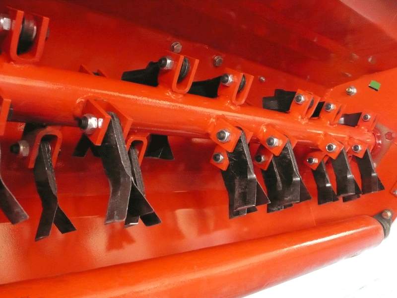 vista da sotto notare il rotore e le mazze montate queste sono ottime per triturare anche i residui da potatura mentre i coltelli no.