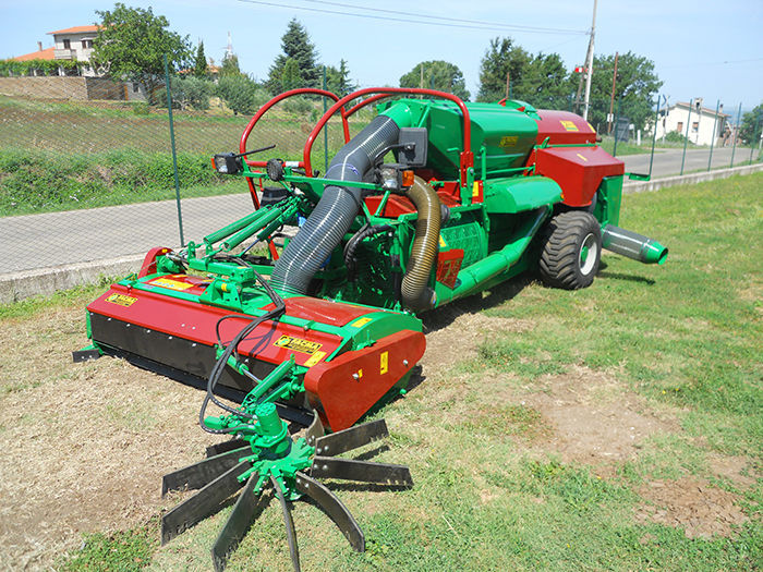 questa è collegata a un antonio carraro reversibile(notare la spazzola laterale in gomma la sua funzione è di allontanare le nocciole vicino alle piante e spostarle sul piano di raccolta della macchina) e davanti monta un cestello elevatore che una volta riempito l'operatore si sposta e va a scaricare il contenuto in un altro rimorchio.