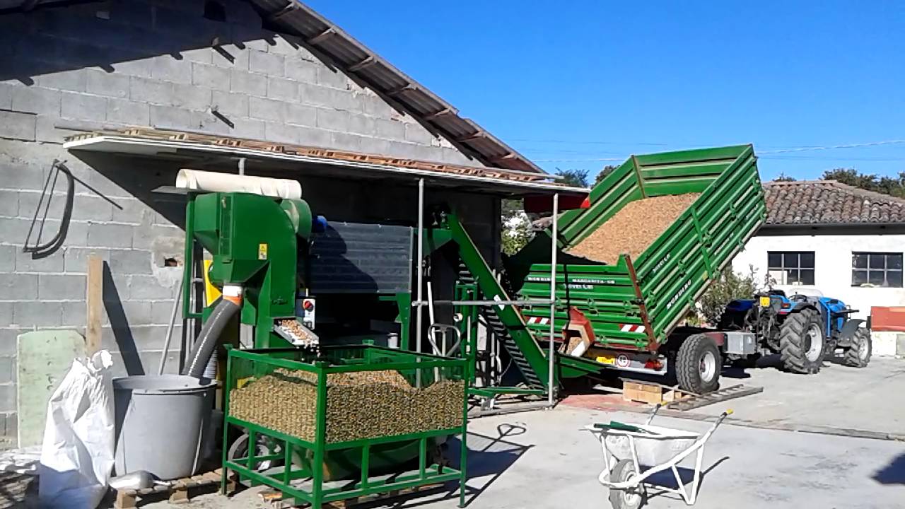 un esempio di impianto di pulitura a secco in questo caso il rimorchio scarica le nocciole da pulire nella tramoggia del nastro trasportatore che le scarica nel prepulitore questo rimuove le piccole pietruzze e i ciottoli e qualche altro residuo separando meccanicamente dalle nocciole e il resto dei residui leggeri,poi a seguire c'è il pulitore questo separa le nocciole vuote o gusci rotti e steli d'erba secchi e foglioline secche dalle nocciole buone e intatte che vengono scaricate o nei sacchi oppure nei cassoni a rete che vengono movimentati mediante l'uso del muletto