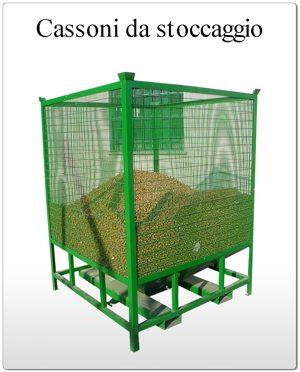 i cassoni da stoccaggio vengono caricati dal alto e movimentati da muletti possono esser posizionati uno sopra l'altro e quando si devono scaricare le nocciole sotto alla loro base c'è una leva che apre la botola di scarico...