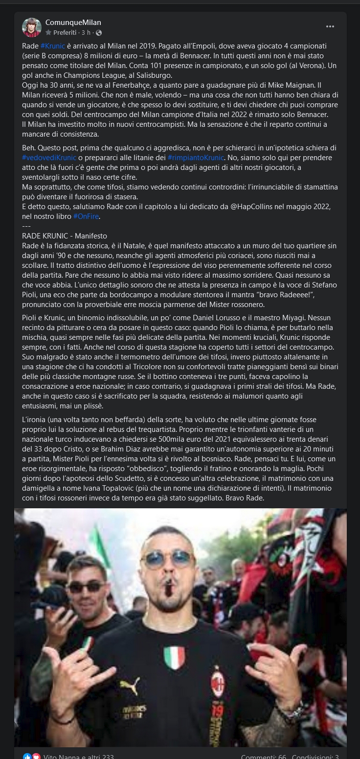 Peraltro Musah nel suo ruolo (mezzala) aveva ben impressionato nei primi mesi della stagione. Purtroppo quando parti con l'handicap Pioli (e con quello accessorio degli infortuni) girano sì i coglioni per i furti arbitrali ma ti rendi conto che nella situazione di subirlo, il furto, ti ci sei messo tu. Ciò detto, vorrei ricordare che sono anni che prendiamo cazzi in faccia dagli arbitri, anche nella stagione dell'ultimo Scudetto abbiamo vinto nonostante una sequela di furti che in una vita che seguo il Milan non avevo mai visto: ho visto furti eclatanti come il gol non dato a Muntari, che ci è costato un campionato, ma erano episodi più o meno isolati, mentre una tale sequela di pisellate onestamente fatico a ricordarla. D'altronde con un presidente che nel pre partita di un quarto di finale di Coppa Italia snobba apertamente ai microfoni la competizione fai fatica a pensare che quello stesso presidente si spenda granché a livello di soft power nei palazzi della Lega.