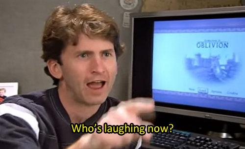 Bisogna innanzitutto capire cosa cerca il pubblico di bethesda. Sostanzialmente sono da dividersi in due categorie: quelli più casual e gli arcòr (come va di moda dire oggi). Ai primi fregancazzo della mancanza di logica e coerenza nel mondo di gioco, di narrazione e caratterizzazioni inesistenti, dell'assenza di scripting e di un'amalgama degli elementi del mondo e di tutte le altre vaccate marchio di fabbrica di beth. Loro pigliano il gioco, lo vedono come un grosso parco a tema e ci girano scazzati a far cagate e tirando in piedi situazioni assurde. Gli arcòr invece il gioco a malapena lo provano. Vivono per buttarci dentro almeno 107 mod diverse e godono della sfida di riuscire a far partire il gioco con tutto quel carrozzone sopra. Poi al massimo quando esce una uber mod/total conversion giocano quella. Ci sarebbe poi una terza categoria entrata in gioco di recente: i fan di Fallout che continuano a seguire il brand, ma quello è un discorso a parte.