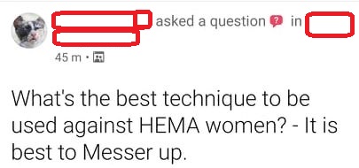 dovete sapere che in uno dei club della città, il club di scherma storica famigerato per essere 1 ora allenamento 3 ore woke politics, c'è un travone di 2 metri. tizio/a pretende di combattere nelle categorie femminile, e di norma si bulla pure quando tritura le ragazzine di 160cm. anche lui abbondanti problematiche mentali esternate sui social e di norma vezzeggiate come coraggiose prese di posizione dal resto della cumpa. Tipo che una volta, dopo che a londra ci fu un famoso attacco a una coppia di lesbiche, questo/a scrisse un post su fb dove diceva testuale IF YOU ARE A CIS WHAT HAPPENED IS YOUR FAULT TOO!! IF YOU ARE CIS, GO FUCK YOURSELF!! Quella volta qualcuno la flaggo a fb, e lei/lui fece poi un post di scuse, con la gente a dare pacche sulle spalle e NOOOOO YOU DON'T HAVE TO APOLOGISE YOU JUST VENTED OUT YOUR RIGHTFUL ANGER !!!!. Ah, pronome selezionato they, se non erro.