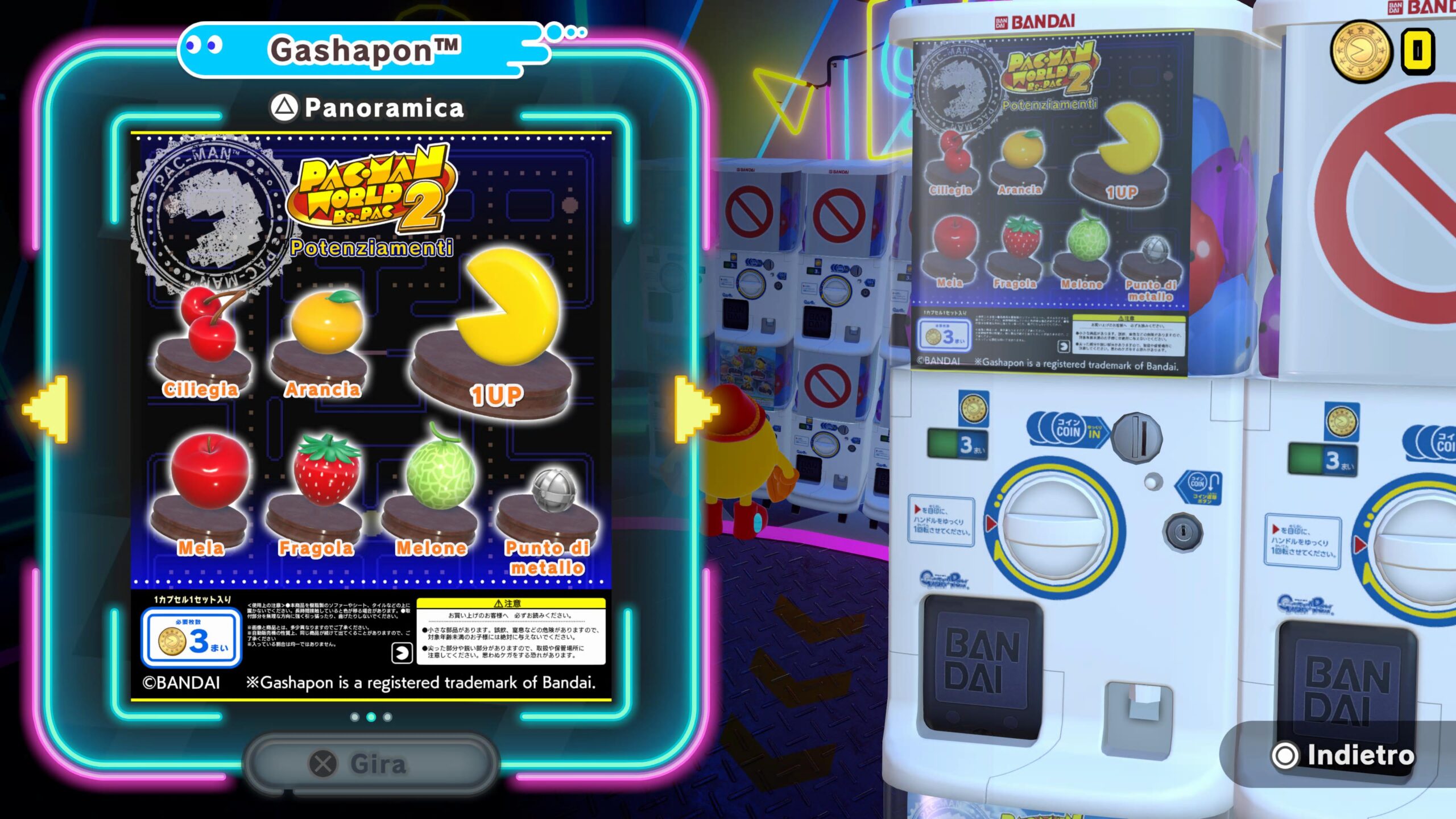 Oltre a riproporre la possibilità di giocare all’infinito il capostipite del franchise, la sezione Arcade di Pac-Land propone cabinati realizzati con lo stesso motore del gioco. Unica regola: per poterci giocare dovrete prima sbloccarli andando avanti nell’avventura principale e recuperando specifici collezionabili. Come se vi trovaste all’interno di uno Shenmue o uno Yakuza qualunque, potrete anche dilettarvi con simpatiche macchine Gacha, che solleticheranno il vostro spirito collezionistico.
